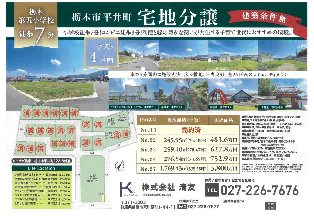 | 物件名 | 栃木市平井町 分譲地4区画 |